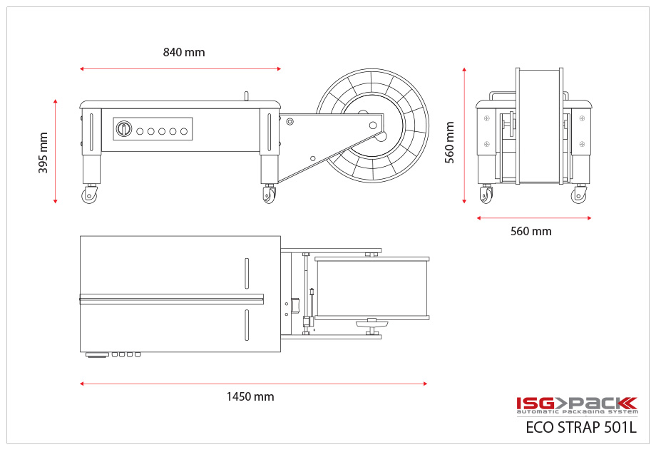 La reggiatrice semiautomatica Eco Strap 501L utilizza una alimentazione elettrica da 220 V | 1 ph | 50/60 Hz ed ha un’altezza del piano di lavoro di 395 mm. Ha una velocità di reggiatura che va dai 10 ai 15 cicli per minuto con una forza massima di tensionamento regolabile fino a 45 Kg. La reggiatrice è corredata di quattro ruote pivottanti di cui due con freno ed un sistema di smontaggio guida reggia easyfast® (senza utensili). Inoltre è presente: regolazione tempo di raffreddamento della saldatura (COOL TIME), regolazione temperatura della lama saldante, regolazione lunghezza della reggia da erogare, funzionamento dei motori solo durante il ciclo di reggiatura, possibilità di utilizzare diverse misure di reggia.