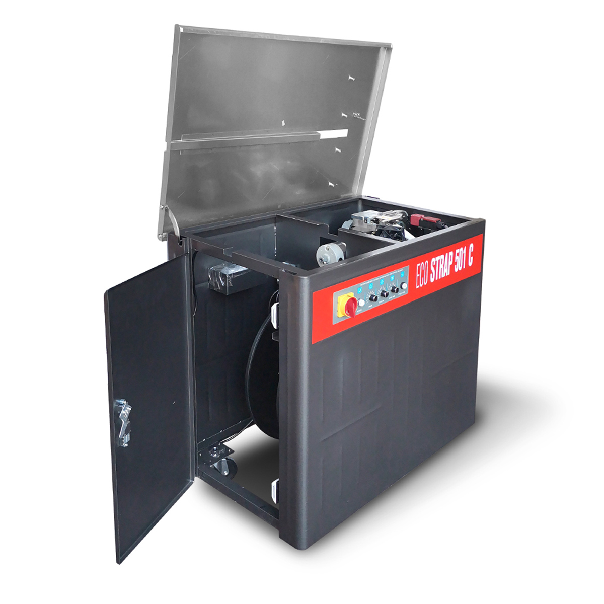 The new generation semiautomatic strapping machine, mod. ECO STRAP 501 C, has a fully closed structure that can be inspectable internally through the working table and the lateral door for strap coil changing. It is equipped with DC motors that control each function of the machine and has an electronic strap tensioning adjustable by potentiometer placed on the control panel. Thanks to its pivoting wheels it can be easily moved and located according to the warehouse needs. Very competitive price and compact strapping machine, extremely efficient for any medium-low working capacity. It is suitable for boxes, packages, bundles strapping. It can be used in warehouses, offices, supermarkets, shops, logistics, anywhere a safe packaging is required.