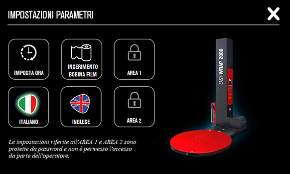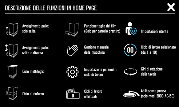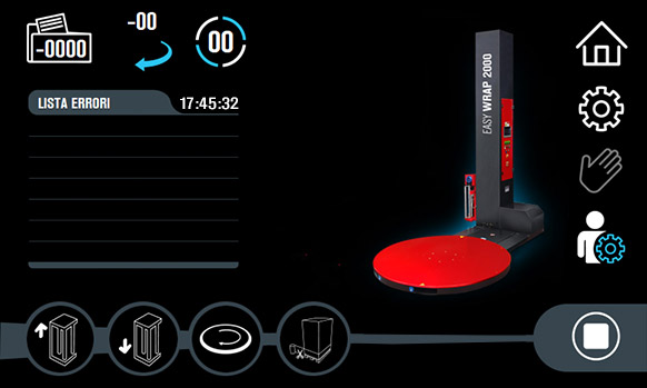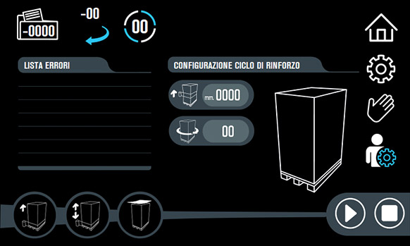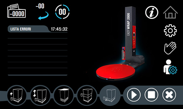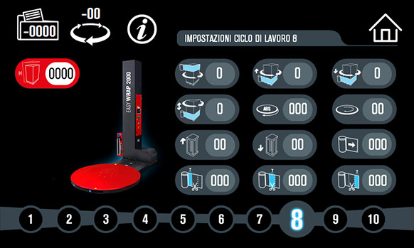 Since January 2021, significant improvements have been made in the use and management of the machine on the user side. In addition to the language selector, the navigation logics on the touch screen have been updated and simplified to make the most of the potential of this winder. Each screen is equipped with an information icon that briefly describes the specification of the commands on the display, with instant warnings that alert the operator of any anomalies or alarms during work operations. The operations aimed at reinforcement cycles on pallets and the settings of the work cycles have been revised, which give the possibility to manage and store up to 10 different work settings, optimizing (based on the values entered), a considerable saving of the stretch film.